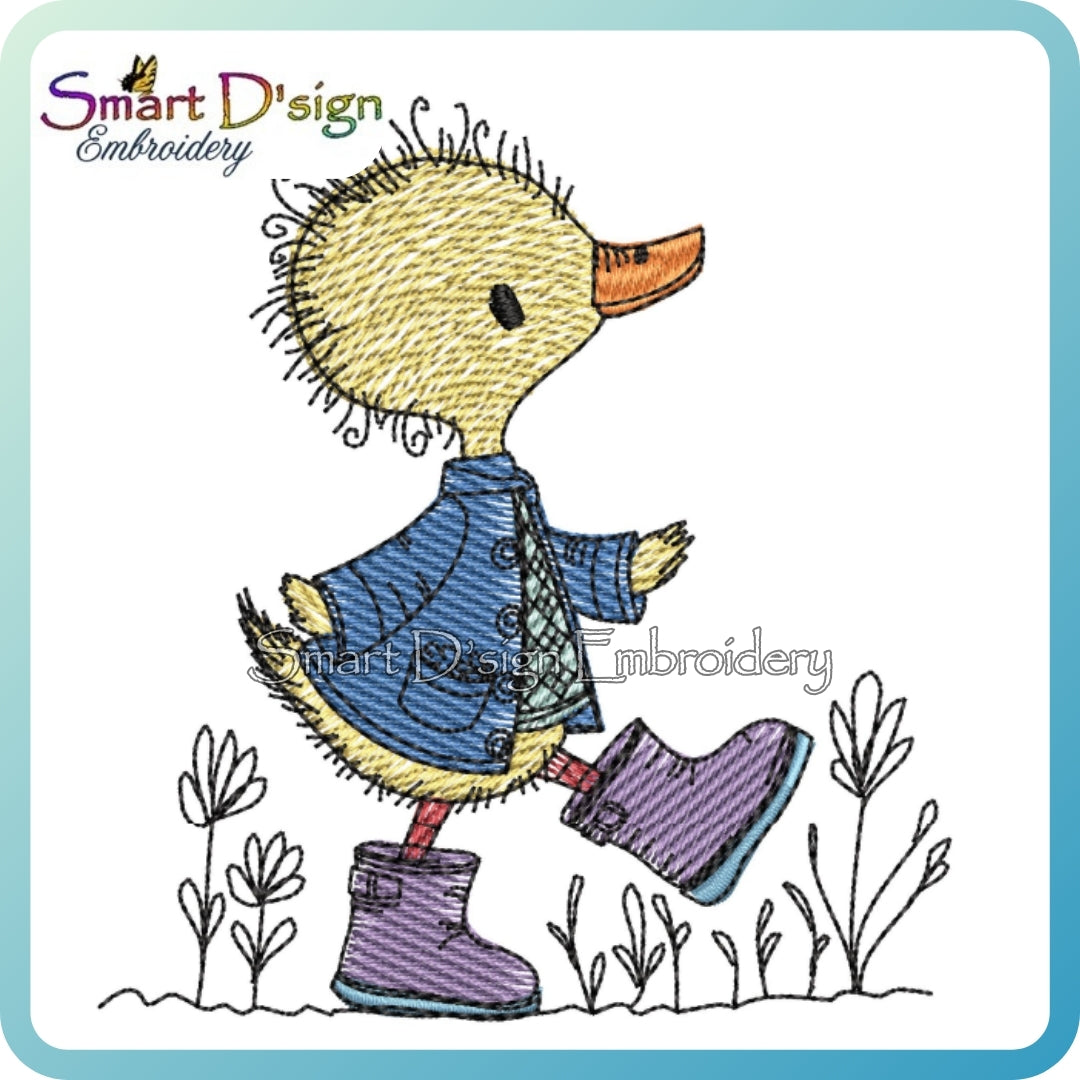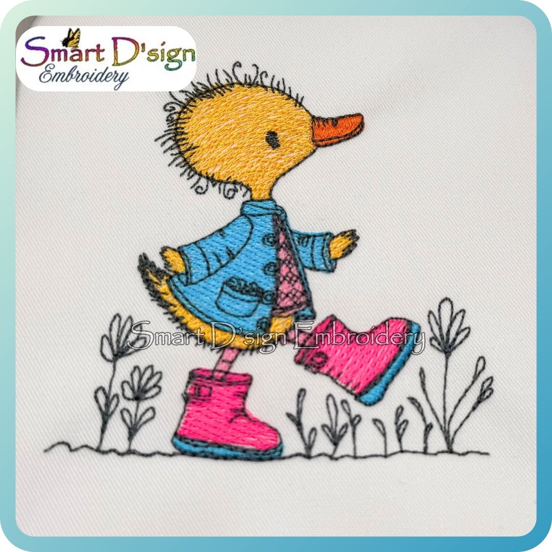 Süße Frühlingsente, die im Sketch-Stil durch eine Blumenwiese spaziert – natürlich mit Gummistiefeln.
