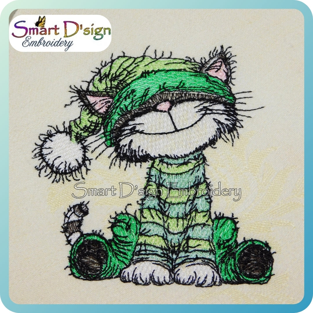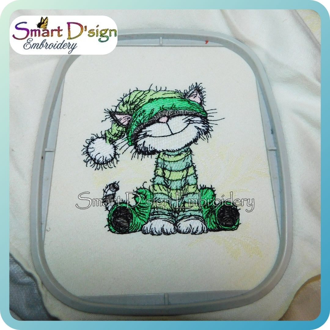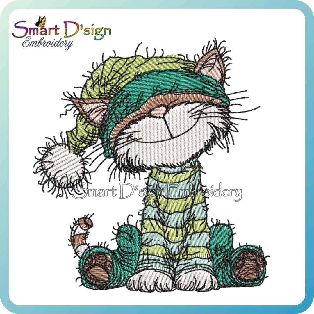 Fröhliche Katze im Pyjama, gestaltet im lockeren Sketch-Stil mit dezenter Füllung.