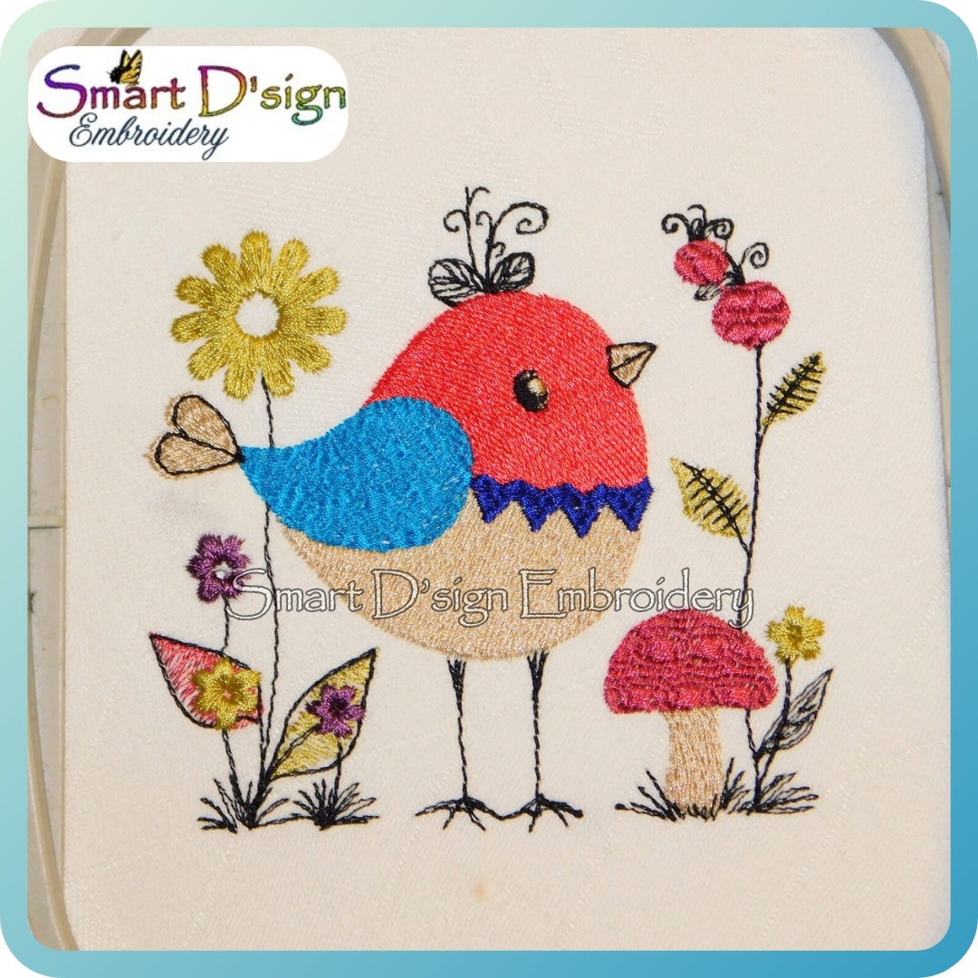 Zarter Herbstvogel mit kleinen Blumen und Beeren.