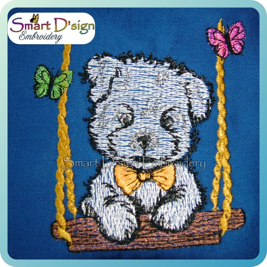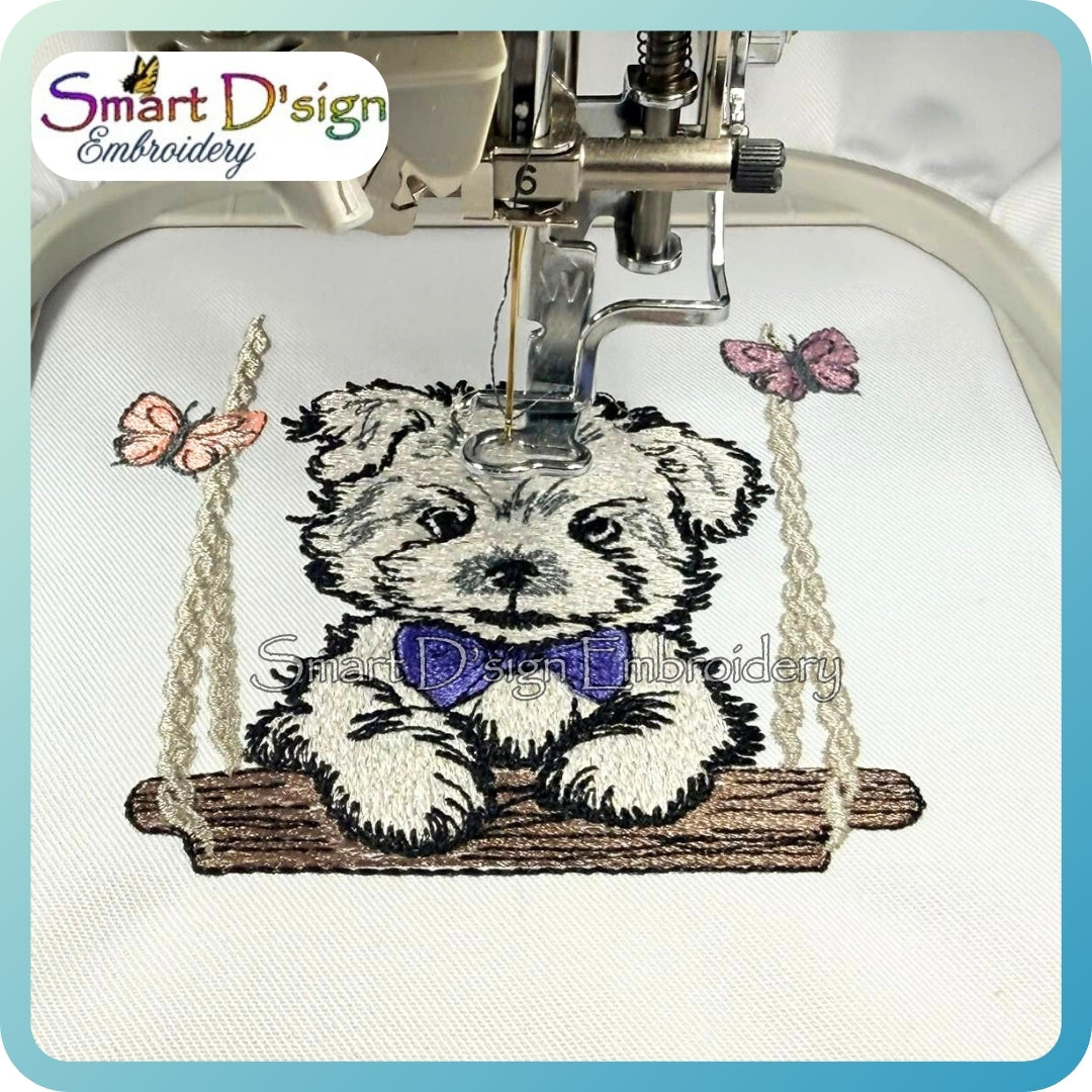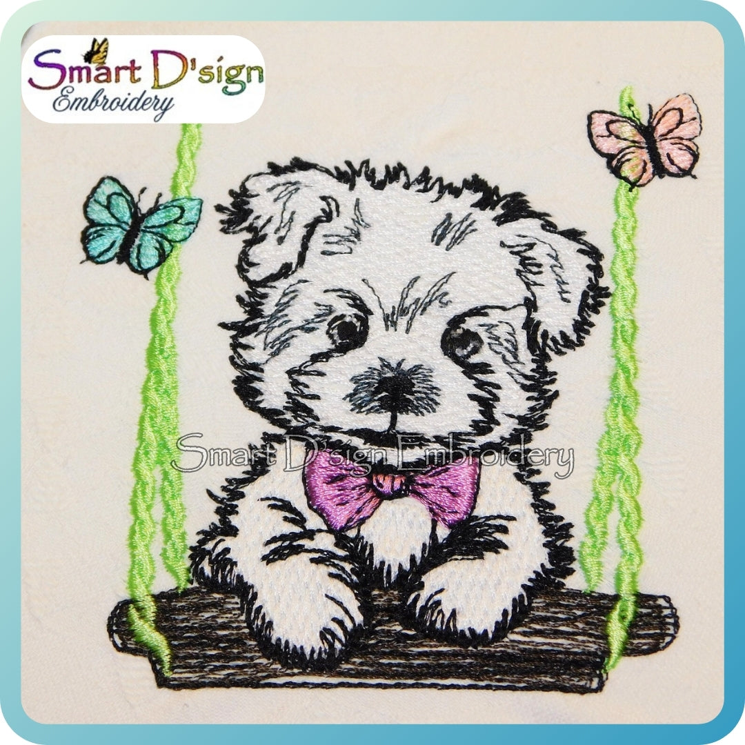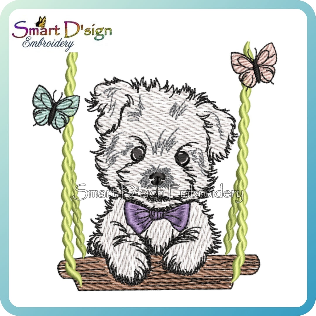 Niedlicher Welpe auf einer Schaukel im skizzenhaften Stil mit leichter Füllstich-Optik.